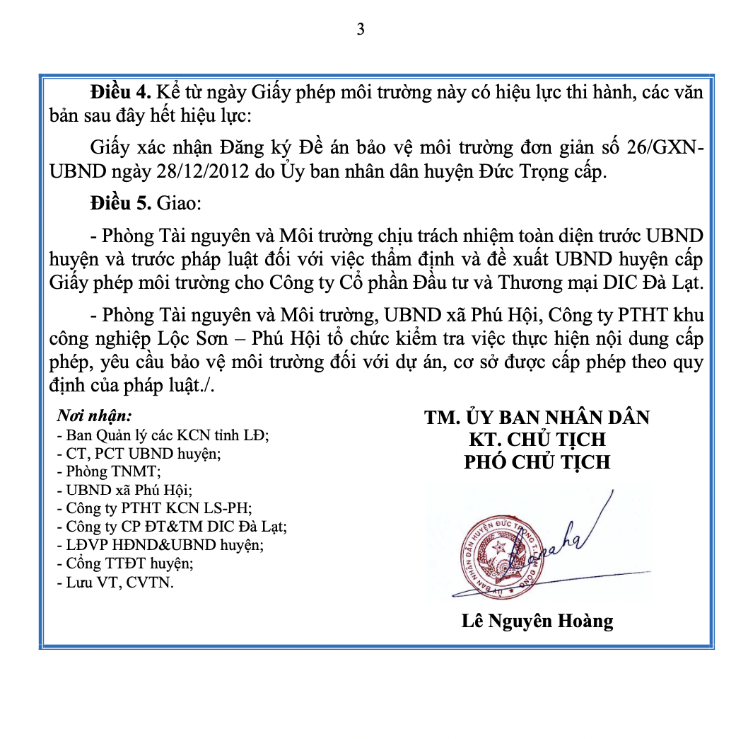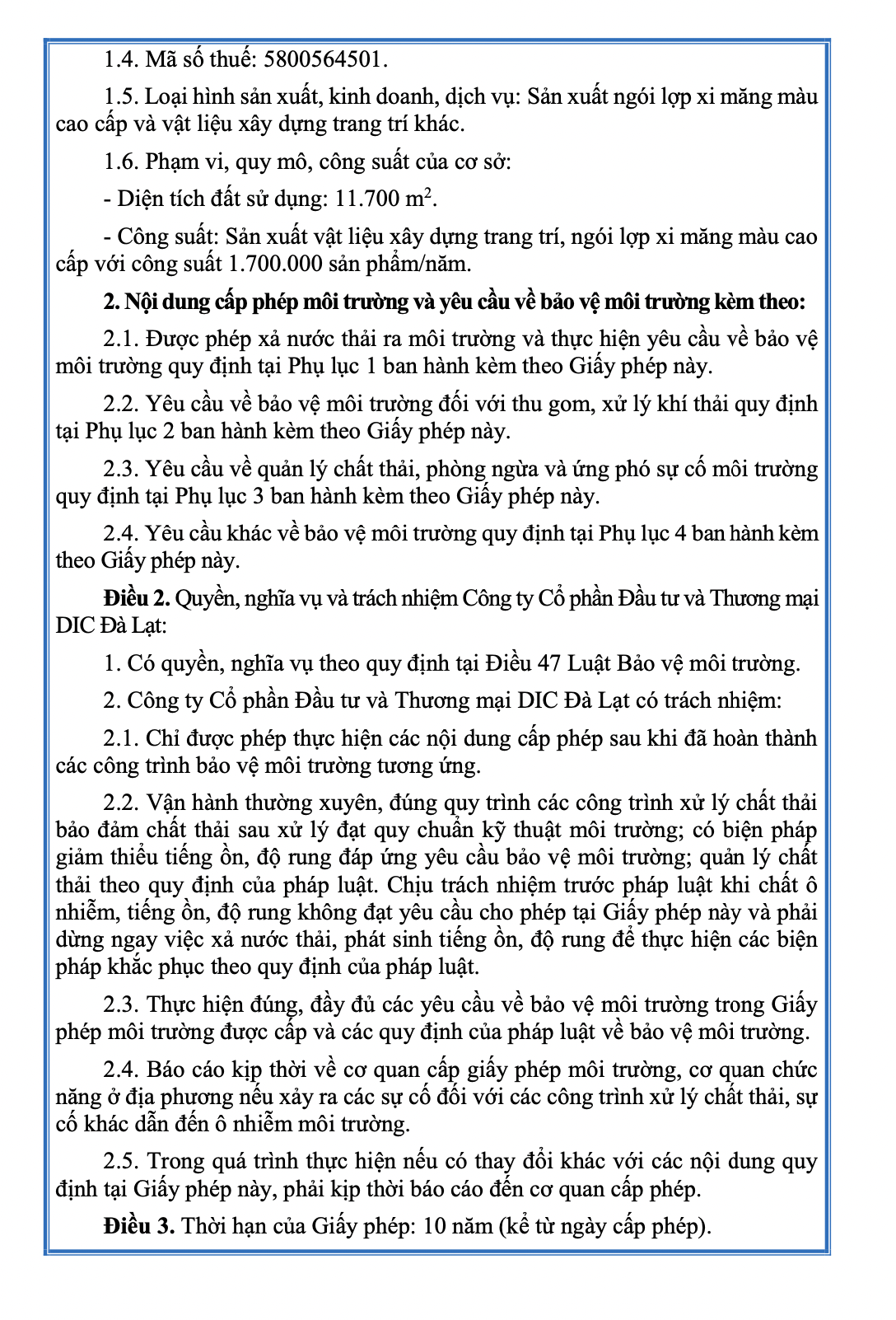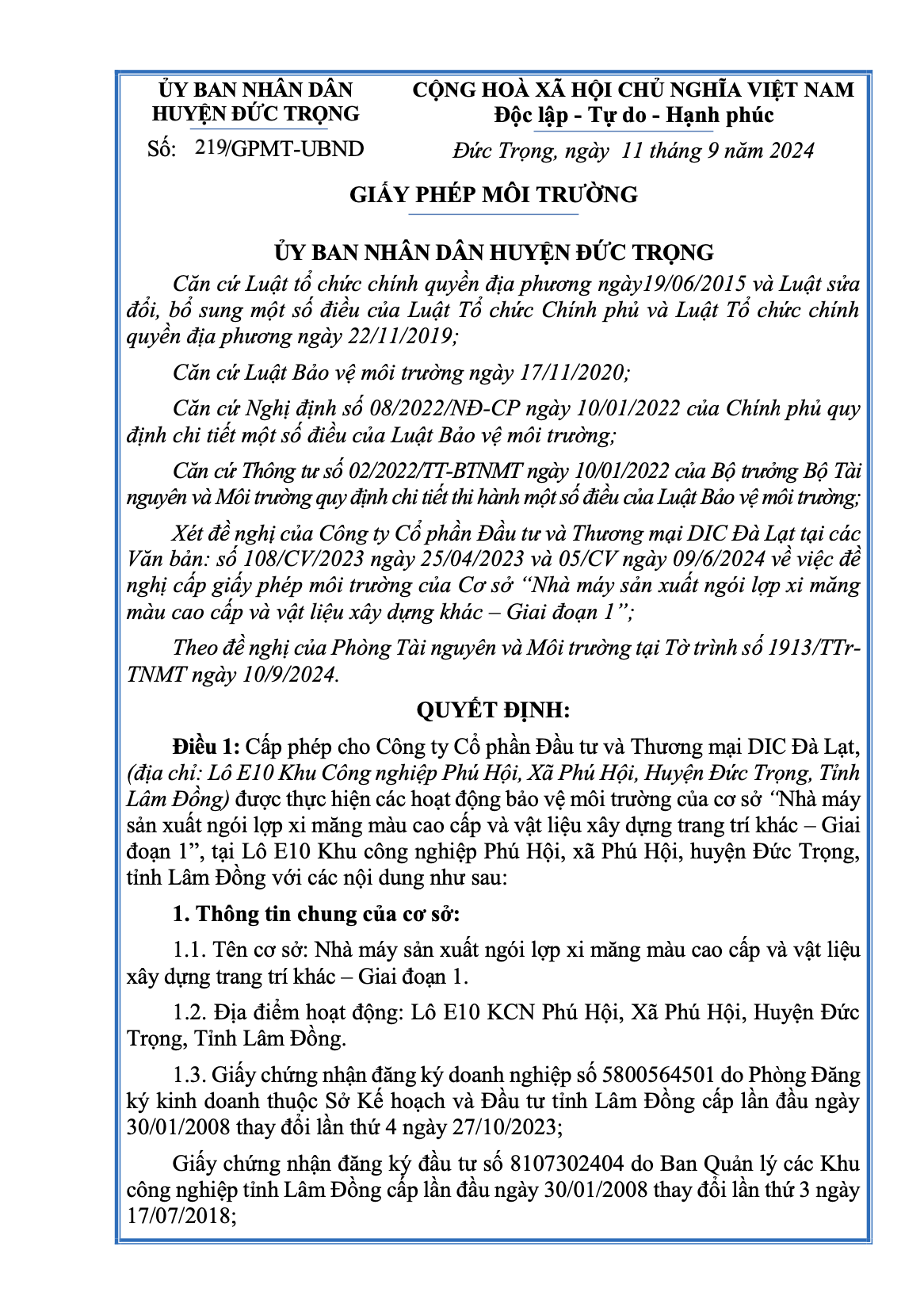 Ngày 11 tháng 09 năm 2024 Công ty Cổ phần Đầu Tư và Thương Mại DIC Đà Lạt đã được Uỷ Ban Nhân Dân huyện Đức Trọng cấp Giấy phép môi trường số 219/GPMT-UBND.